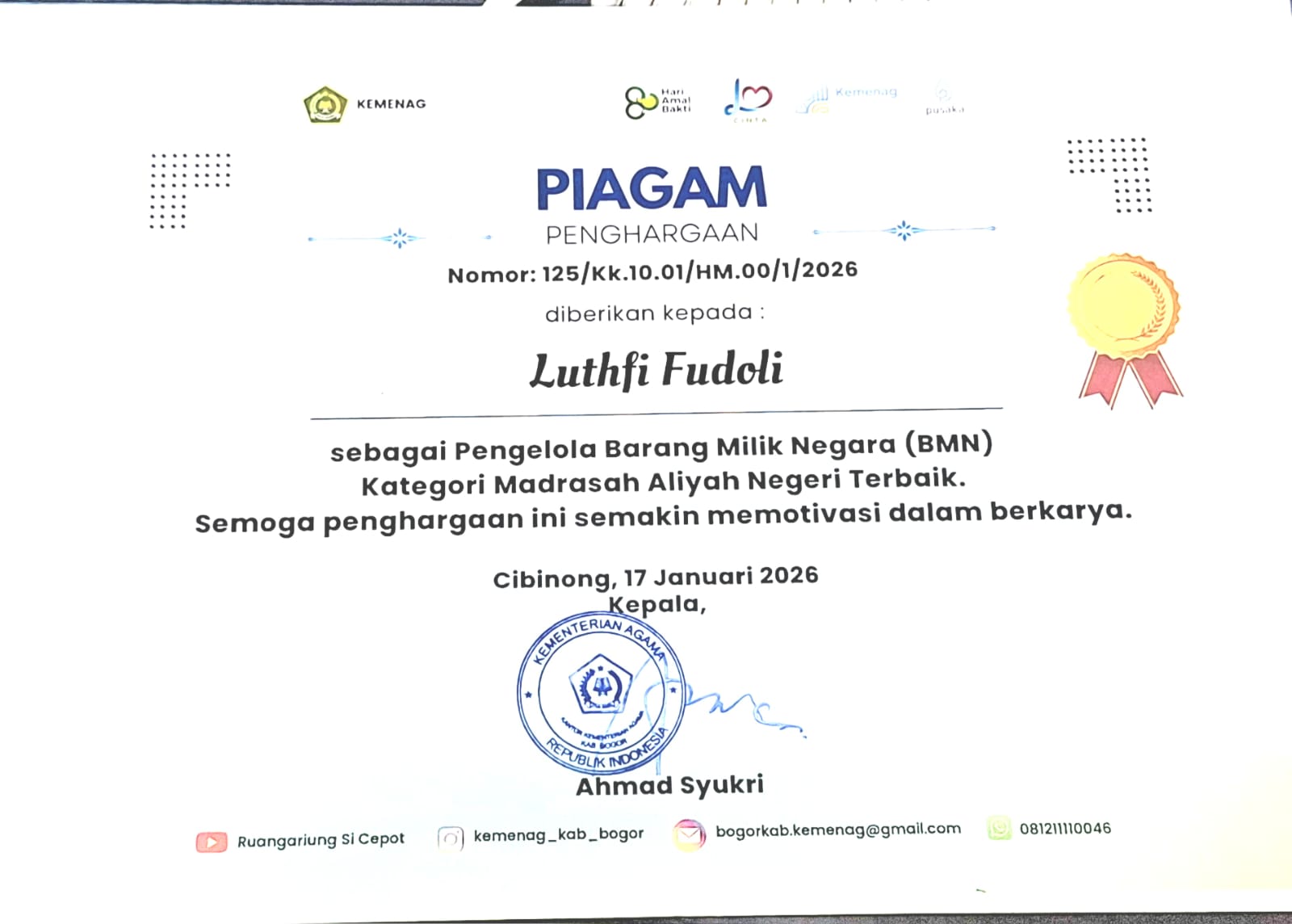 Sebagai bentuk apresiasi dan stimulus atas kinerja yang baik, Kementerian Agama Kabupaten Bogor memberikan penghargaan kepada Luthfi Fudoli, pegawai MAN 2 Bogor, sebagai Pengelola BMN Terbaik Tingkat MA. Penghargaan ini merupakan hasil dari komitmen dan konsistensi dalam pengelolaan, penataan, serta administrasi BMN secara tertib dan akuntabel.