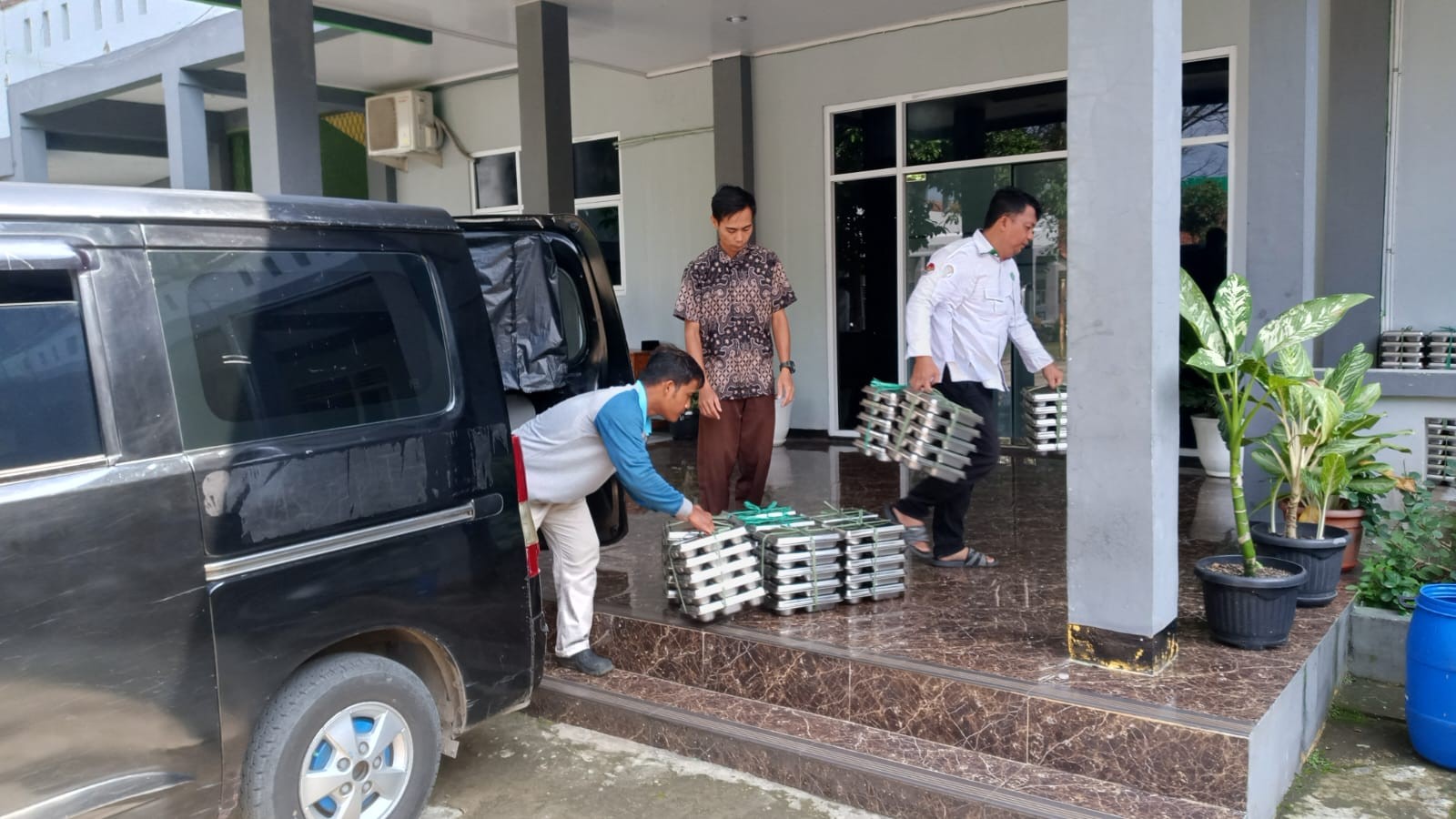 Penurunan dan Pemeriksaan Awal Begitu kendaraan logistik tiba, petugas dengan sigap menurunkan boks-boks makanan. Proses ini dilakukan dengan memperhatikan aspek sanitasi, memastikan boks tidak diletakkan di sembarang tempat untuk menjaga higienitas kemasan.