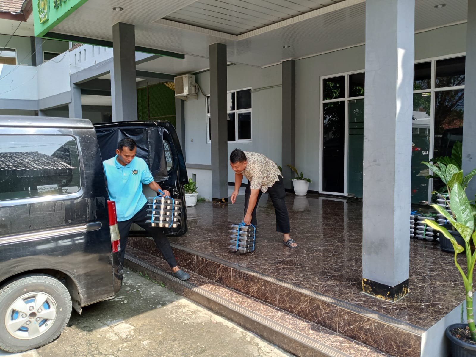 Setibanya di lokasi, sopir dari tim SPPG langsung menurunkan wadah makanan yang berisi nasi dan lauk-pauk. Proses penurunan tersebut tidak dilakukan sendiri, melainkan dibantu oleh Tim MBG madrasah, termasuk Bapak Widi Winachyu yang turut aktif dalam kegiatan tersebut.