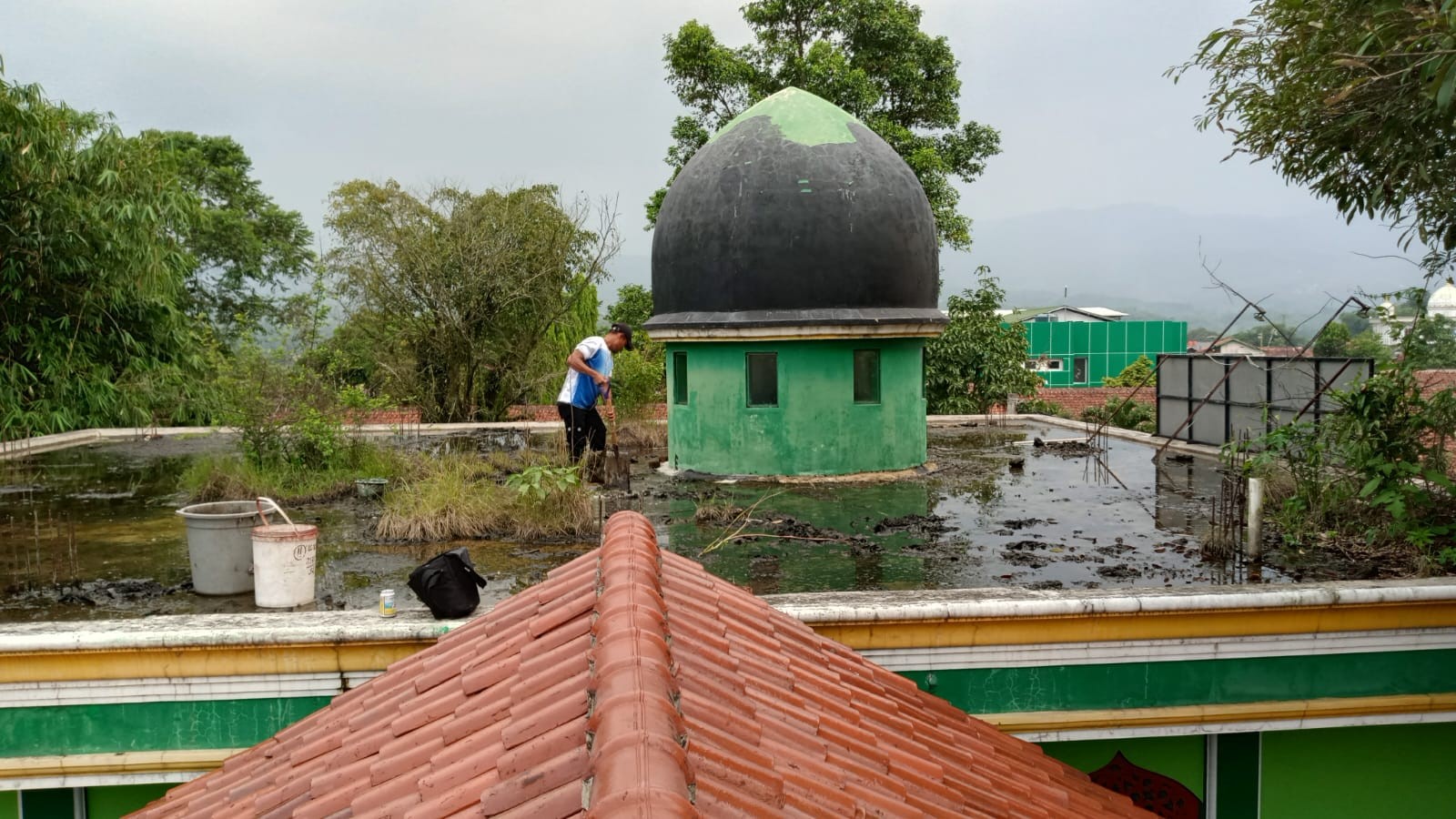 Dengan penuh kehati-hatian, Bapak Armando merapikan area sekitar kubah, mencabut tanaman liar, dan membersihkan sisa-lumut yang menempel. Keberadaan lumut dan ilalang di area tersebut jika dibiarkan tidak hanya mengganggu estetika bangunan, tetapi juga berisiko merusak struktur permukaan kubah dan menyebabkan saluran air tersumbat.