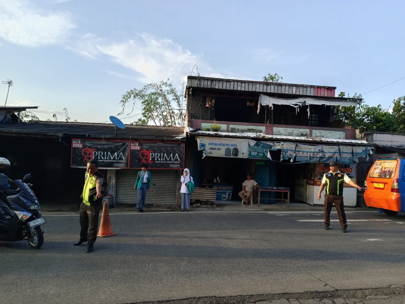 Dalam kondisi cuaca yang cerah, petugas keamanan madrasah, Bapak Dede Husni dan Bapak Jambul, tampak sigap menjalankan tugas rutinnya di depan gerbang sekolah. Mereka mengatur arus lalu lintas yang meningkat akibat banyaknya kendaraan yang mengantar siswa, sekaligus membantu menyebrangkan siswa dan warga madrasah dengan aman.